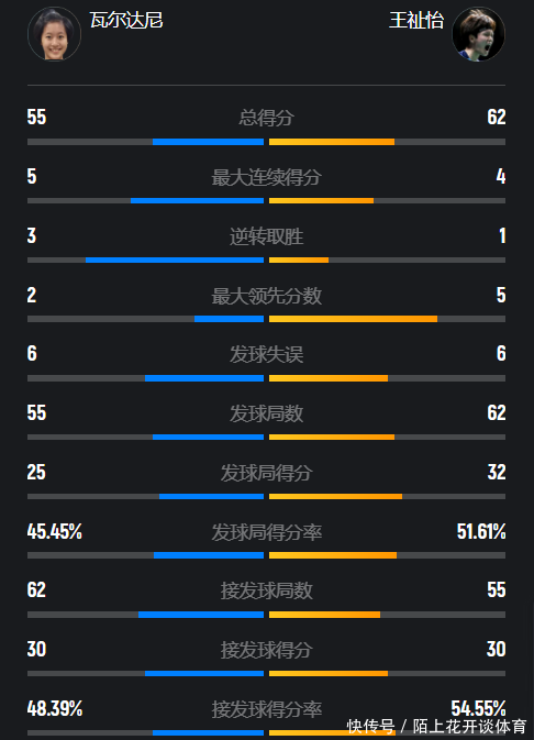 首局比赛开打之后,可以明显看出来瓦尔达尼想要终结面对王祉怡不胜魔咒的决心,击球的发力非常猛,但效果并不好,连续的劈杀底线出界,让王祉怡笑纳大礼,早早建立起了3-1的领先,不过瓦尔达尼并没有改变自己的打法,只要王祉怡的推挑稍微不到位,她就能够利用自己头顶区劈杀制造威胁,凭借坚决的出手,瓦尔达尼迅速抹平了分差,并且带着11-10的微弱领先,结束了前半局的争夺。